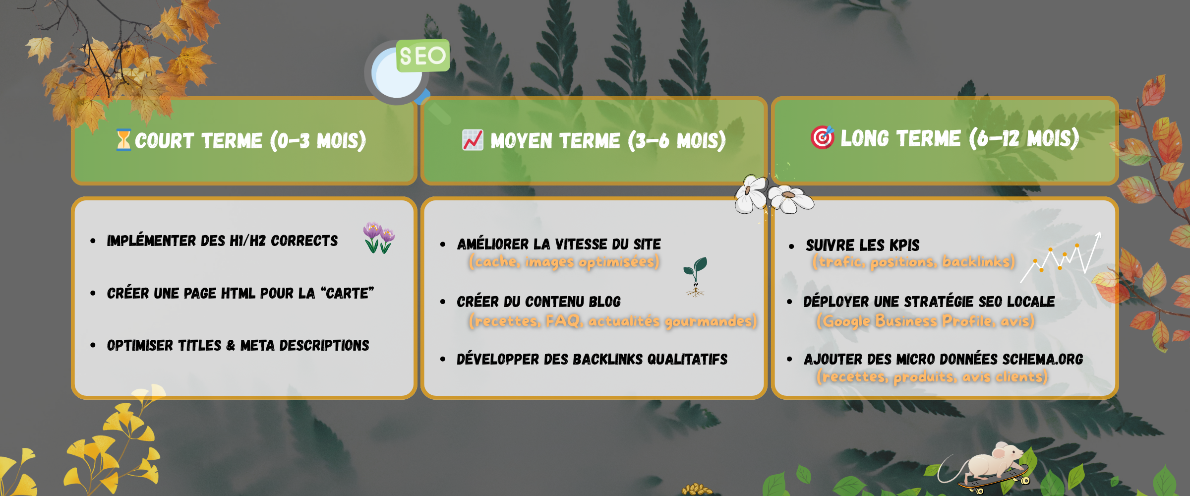 🍃 Pour que le plan SEO soit plus clair et facile à suivre, il est présenté comme un cycle de croissance, où chaque étape correspond à une saison du site :