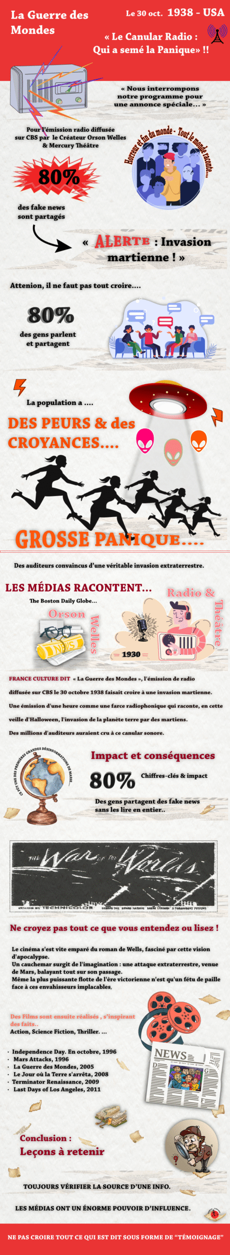 Dans le cadre du concours Défi Métiers, j’ai réalisé une infographie autour d’un événement médiatique marquant : la diffusion radiophonique de La Guerre des Mondes en 1938. Cette création interroge la manière dont une fiction peut être perçue comme réelle et devenir, avec le temps, un mythe médiatique.