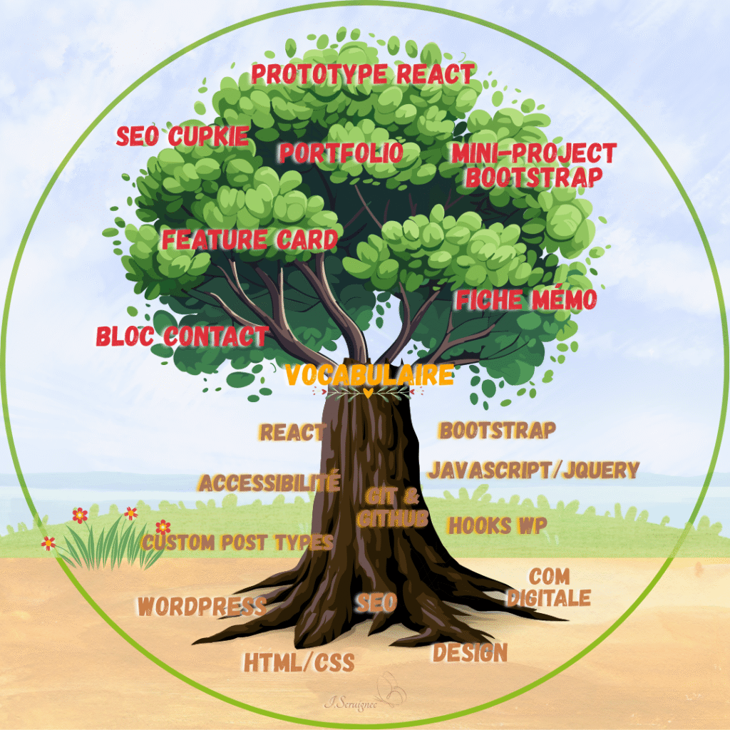 - Clarification du vocabulaire technique web : Frameworks, bibliothèques, grilles responsives, composants, hooks, API, typographie, wireframes, prototypes…